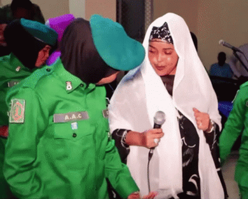 Nimco Happy performs a lively Somalian dance with a woman in a green uniform.