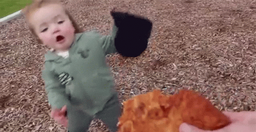 Baby attempts to bite a piece of food but hilariously loses balance and falls down.