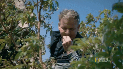 Gordon Ramsay tastes fuchsia directly from a plant in a natural setting, featured on National Geographic.