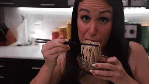 Julia from Hellthy Junk Food eats a large portion of noodles with chopsticks in a kitchen.