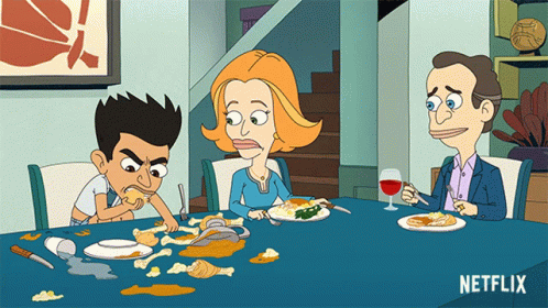 Jay from Big Mouth devours his dinner messily while his parents watch, with the Netflix logo visible.