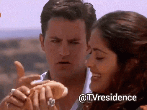 Salma Hayek eats a sandwich while Matthew Perry watches her with a curious expression.