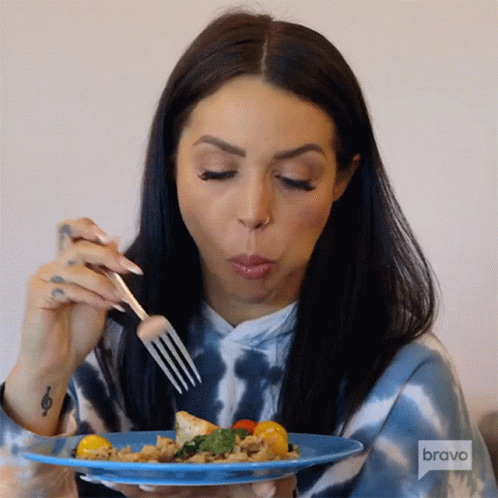 Scheana Shay from Vanderpump Rules enjoys a meal, eating from a blue plate with a fork.