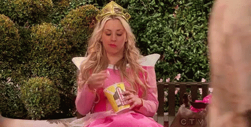 Kaley Cuoco, dressed as a princess, sits on a park bench eating popcorn from a container.