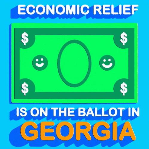 A graphic illustrating that economic relief is a key issue on the ballot in Georgia, featuring a dollar bill with a checkmark.
