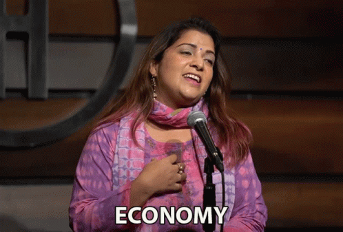 Aditi Mittal on stage speaking, with the word 'ECONOMY' displayed prominently.