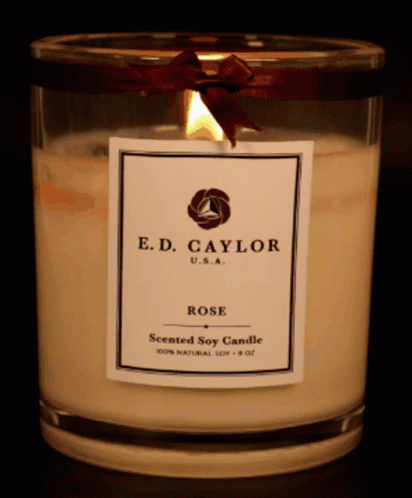 A lit E.D. Caylor Rose Scented Soy Candle, featuring a clear glass jar and a burning wick.