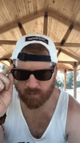 Ed, a man with a beard, adjusts his sunglasses while wearing a white Titleist hat under a wooden gazebo.