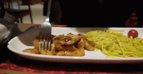 Maks Brandt enjoys a meal of chicken and noodles, savoring each bite with a fork.