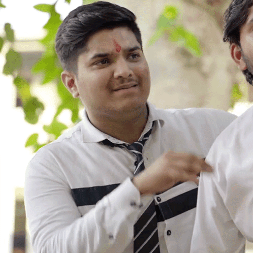 Mridul, a young man with a red tilak, makes a funny face while interacting with someone.