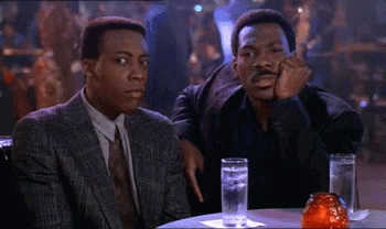 Eddie Murphy and Arsenio Hall sitting at a table, looking intently at something in a club setting.