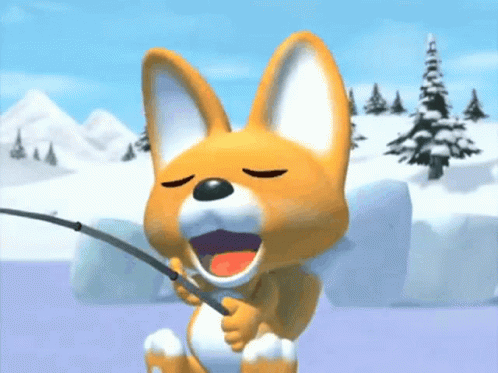Eddy the fox yawns and falls asleep while ice fishing in a snowy landscape.