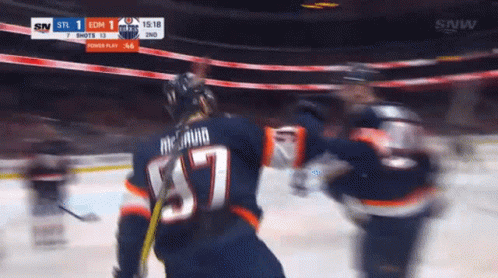 Connor McDavid celebrates a power play goal with his Edmonton Oilers teammates during a hockey game.