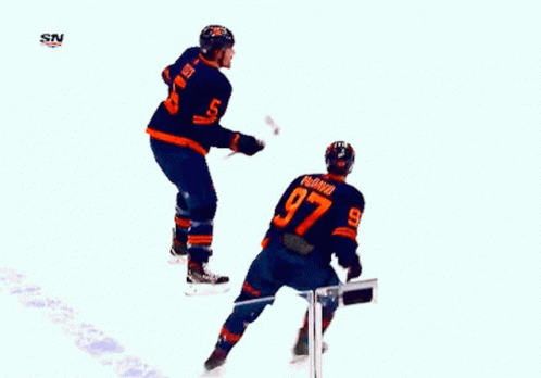 Edmonton Oilers players Connor McDavid and Cody Ceci celebrate a goal with a hug on the ice.