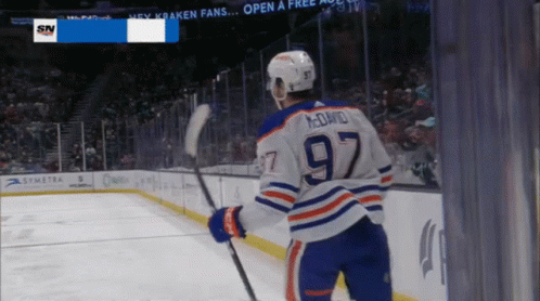 Connor McDavid celebrates after scoring a goal for the Edmonton Oilers in a hockey game.