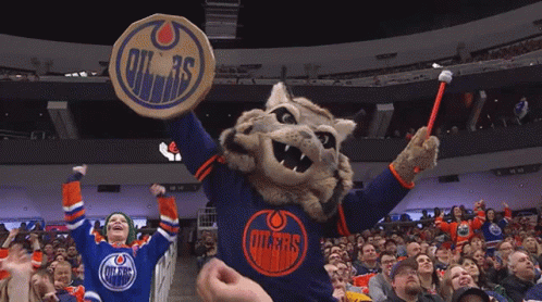 Edmonton Oilers mascot Hunter the Lynx cheers on the crowd at a hockey game.