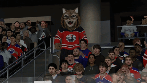 Edmonton Oilers fans cheer enthusiastically with their mascot, Hunter the Lynx, at a hockey game.