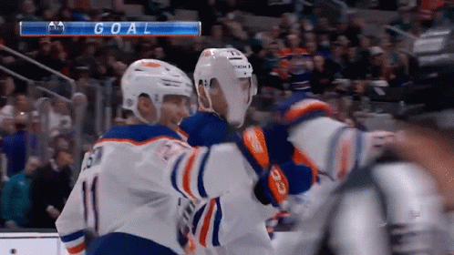 Edmonton Oilers players, including Klim Kostin and Hyman, celebrate a goal on the ice with the scoreboard displaying 'GOAL'.