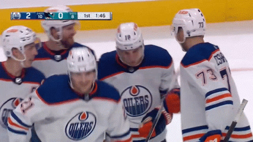 Klim Kostin of the Edmonton Oilers skates on the ice during a hockey game, with the scoreboard showing the Oilers leading.