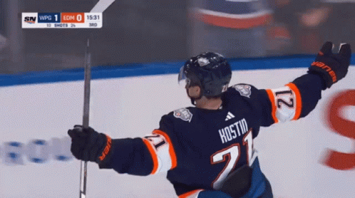 Klim Kostin of the Edmonton Oilers celebrates a goal or win with teammates during a hockey game.