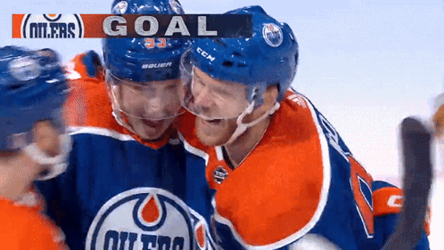 Edmonton Oilers players Ryan Nugent Hopkins, Connor McDavid, and Zach Hyman celebrate a goal on the ice.