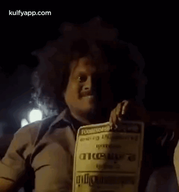 Comedian Pugazh reacts with a funny smile while holding a poster for the movie 'Agent Kannayiram'.