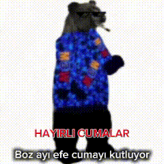 Efe, the brown bear, celebrates Friday with sunglasses and a patterned shirt, wishing 'Happy Fridays'.