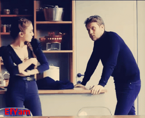Efsun (Damla Sönmez) and Yamaç from Cukur, sharing a moment in the kitchen. A scene from the popular Turkish series.