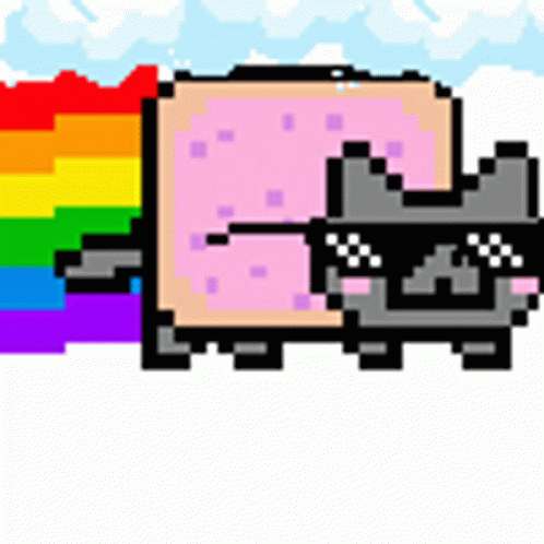 Pixel art Nyan Cat wearing sunglasses, flying with a rainbow trail and Mario on its back.