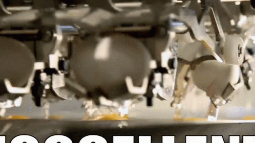 An industrial machine efficiently cracks and processes eggs, with the text 'EGGCELLENT' displayed.