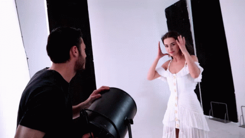 Bensu Soral laughing and posing in a white dress during a fun photoshoot, her hair blowing in the wind.
