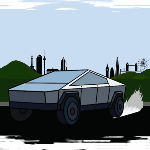 A Cybertruck-like vehicle speeds away from a city skyline with 'I'M OUTTA HERE!' text.