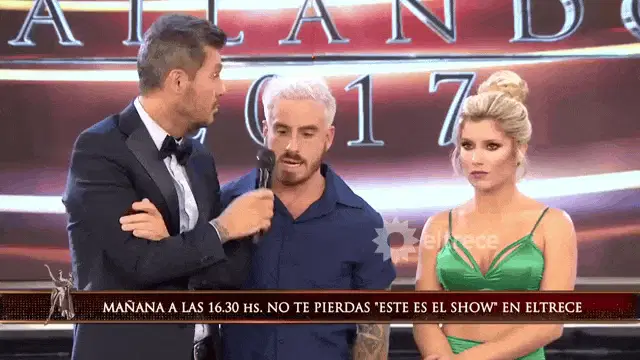 Pampita speaks into a microphone on a TV show set, expressing a lack of strength, with 'eltrecetv.com' visible.