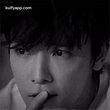 Close-up black and white portrait of Ehyokjae, a man with his finger to his mouth in a thoughtful pose.