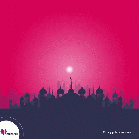Animated greeting for Eid Mubarak featuring a mosque silhouette, crescent moon, and stars.