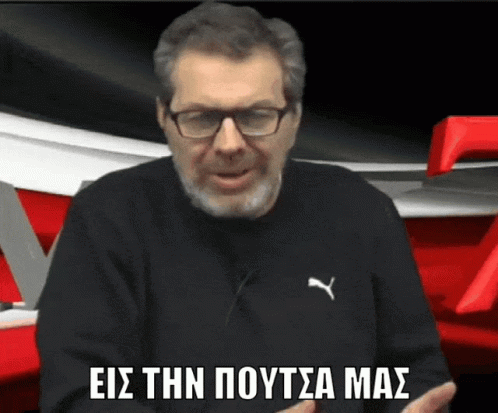 Stefanos Xios delivering his iconic phrase 'Eis tin Poutsa Mas' while wearing glasses and a black Puma shirt.