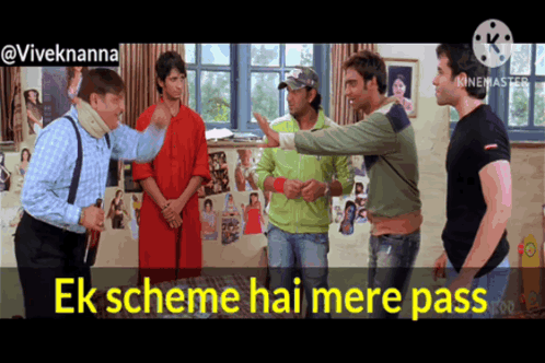 A group of men in a room, one excitedly presents an idea, saying 'Ek scheme hai mere pass'.