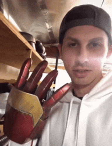 Ekoh in a white hoodie and black cap shows off his Iron Man glove as it lights up for the camera.