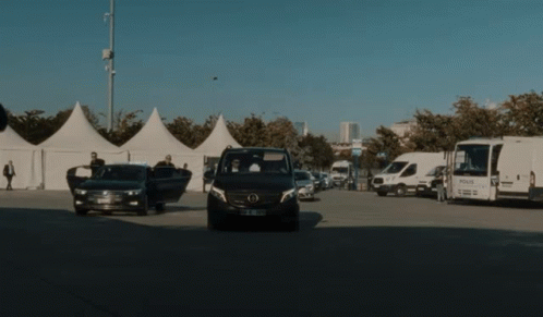 Ekrem İmamoğlu's security detail arrives in black Mercedes van and car at an outdoor event.