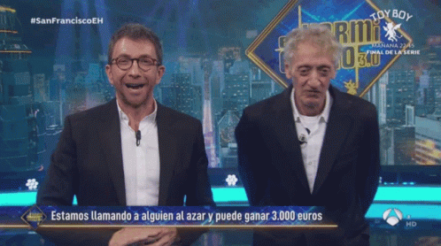 Pablo Motos and Enrique San Francisco on El Hormiguero, waving and smiling. They are calling someone to win 3,000 euros.
