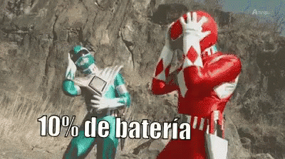Power Rangers react with horror to a phone's 10% battery, symbolizing the dread of low power.