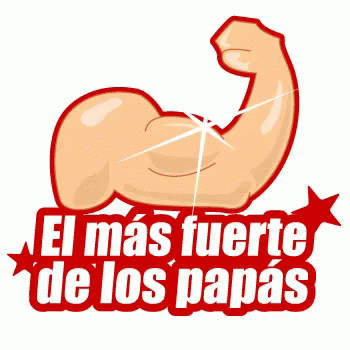 Animated graphic of a flexing bicep with the Spanish text 'El más fuerte de los papás' (The strongest of dads).
