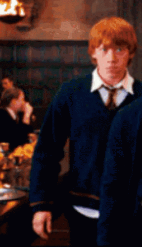 El Pe Lir Roj O Ron (Ron Weasley) stands in a grand hall, wearing his school uniform, looking serious.