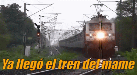 A powerful train approaches with the meme phrase 'Ya llegó el tren del mame' overlaid, signaling a trending topic.