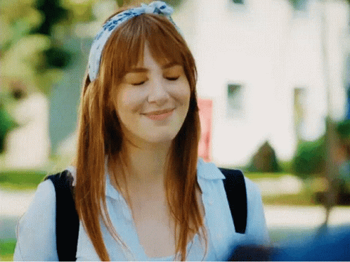 Elçin Sangu as Defne Topal smiles, wearing a blue headband and light shirt, from Kiralık Aşk.