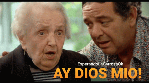 An elderly woman and a man from 'Esperando La Carroza' react with an emphatic 'Ay Dios Mío!' in a memorable scene.