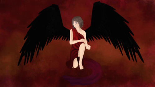 Digital drawing of an Eldarya angel with large black wings and a flowing red dress against a dark background.