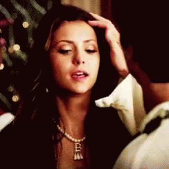 Elena Gilbert from The Vampire Diaries touches her head while wearing a pearl necklace with a 'B' pendant.
