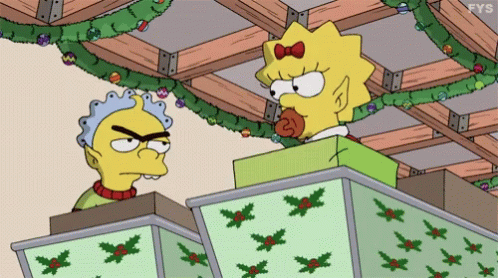 Simpsons characters dressed as elves, with one grumpily saying 'Bah Humbug' during festive Christmas preparations.