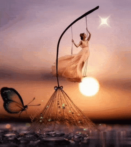 Elia gracefully swings on a giant dandelion against a beautiful sunset sky, with a butterfly nearby.